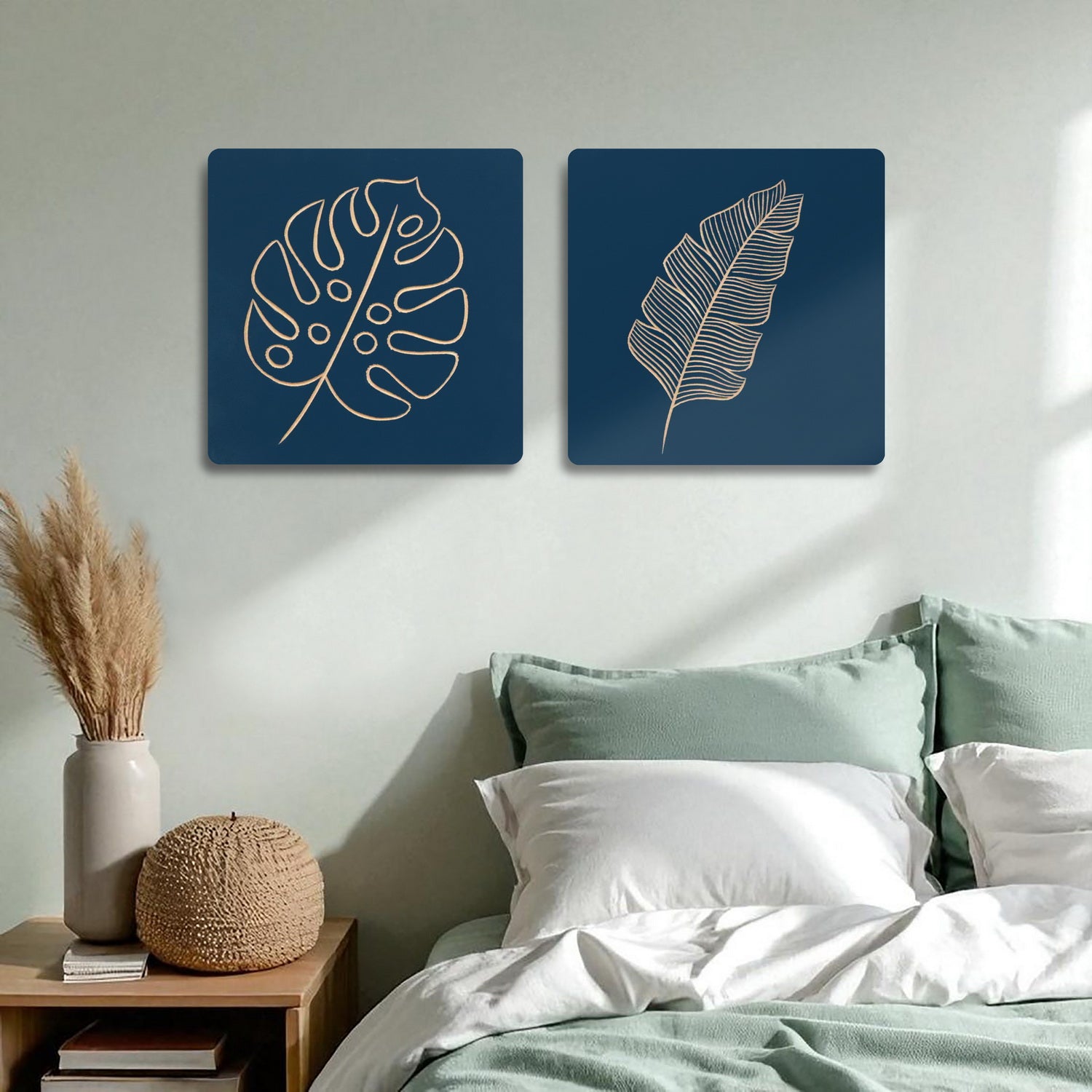 Set of 2 Hand-Carved Leaf Wall Panel (Blue)